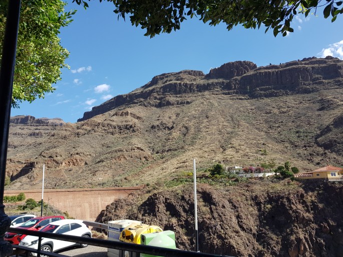 Zurück biegen wir schon vor dem Aqualand rechts ab und es geht noch einmal steil bergauf. Wir durchqueren El Tablero und unterqueren die Autobahn Richtung Sonnenland und sausen dort den Berg hinunter. Auf der GC 500 auf einem breiten Seitenstreifen fahren wir bis zur Tankstelle und von dort Richtung Mercadonna Meloneras wieder auf einem Radweg, Danach Hauptstrasse immer wieder rauf und runter bis wir im malerischen Yachthafen von Pasito Blanco eintreffen. Bisher war Pasito Blanco durch Schranken abegsperrt. Diese Absperrung wurde vor kurzem von den Behörden verboten. Das schauen wir uns gerne an, bevor wir zum Busbahnhof Faro zurückkehren.