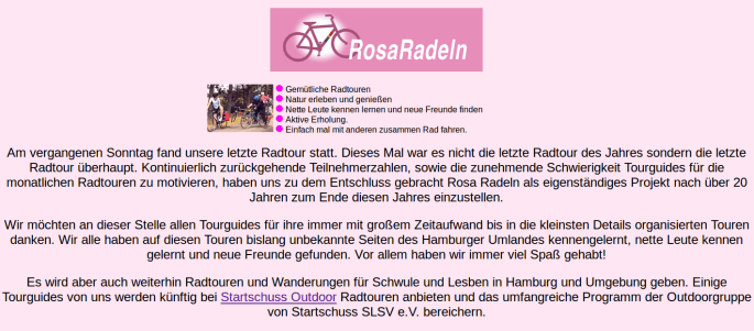 Bis 2015 hat Rosa Radeln Hamburg und Umgebung so ziemlich komplett erkundet. Die Zeiten haben sich allerdings geändert. Dieser abgeschottete Schutzraum für Menschen die anders sind, als die breite Masse, ist so nicht mehr notwendig. Rosa Radeln hat sich aufgelöst.